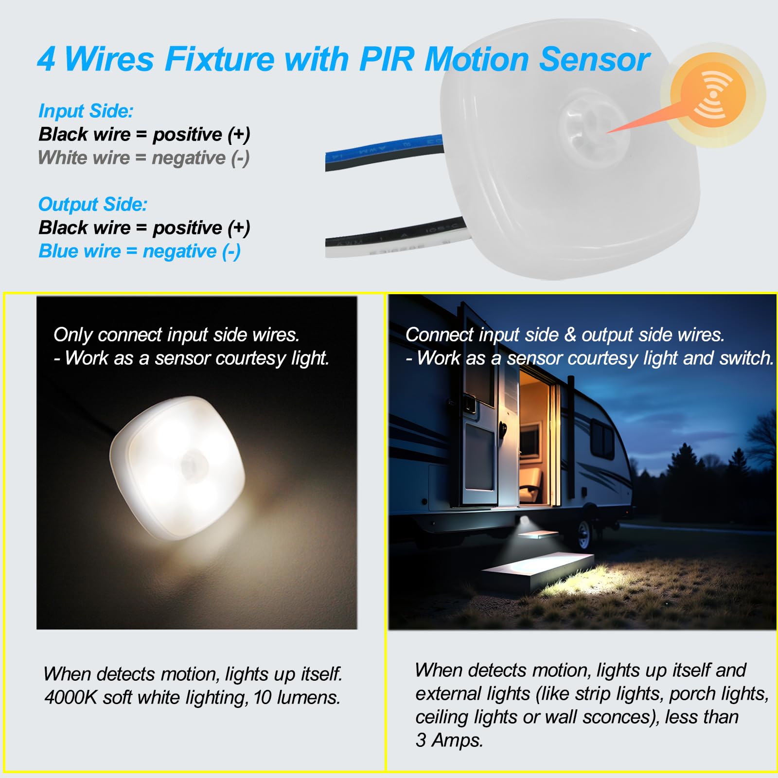 - ✅ Motion Sensor Light & Switch Combo - Mini size: 1.7"L x 1.7"W x 0.9"H. A 4-wires light fixture with lighting and switch dual functions. Only connect black & white wires, working as a courtesy light. It outputs 10 lumens white light. If 4 wires are all connected, it lights up itself and the external lights. Note: the external lights total no more than 3 Amps.