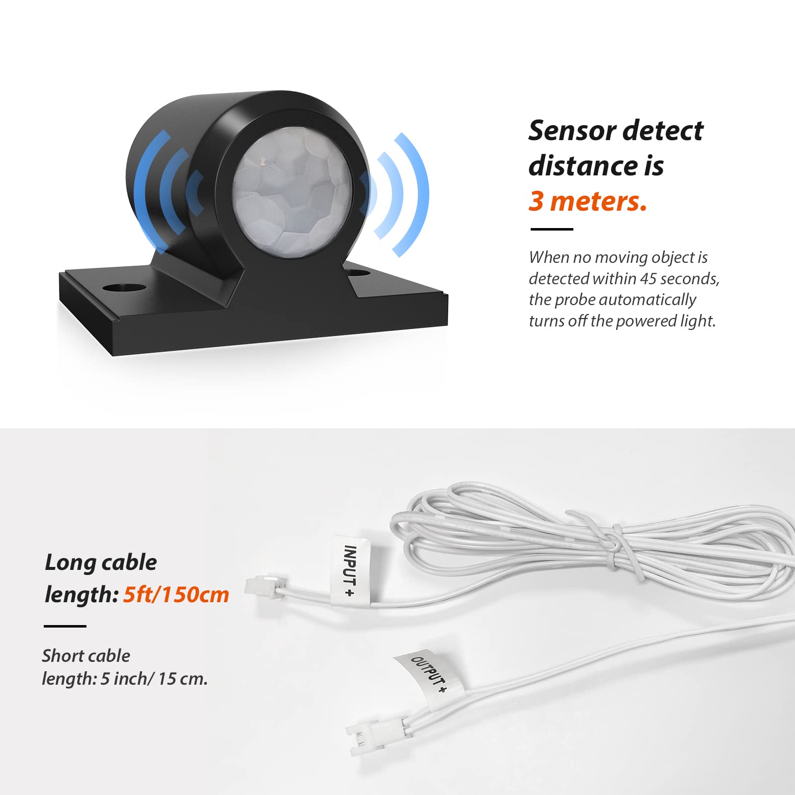 - ăUniversal Fit 12Volt Power SystemăThis mini PIR motion sensor switch is universal compatible for 12volt power system, such as RV, travel trailer, 5th wheel camper, boat, as switch partner with the single color LED lights.
